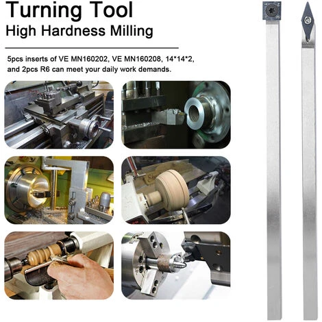 Dies ist ein Set aus hochwertigem Drehwerkzeug und Aluminium-Aluminium-Griff-Set, perfekt für Halbfertig- und Endbearbeitungen. Feine Zähigkeit und Härte, mit langer Lebensdauer. 5-teilige Einsätze von VE MN160202, VE MN160208, 14 * 14 * 2 und 2 Stück R6 können Ihre täglichen Arbeitsanforderungen erfüllen. Vierkant-Stahldorn-Design, dadurch steifer und rollt weniger wahrscheinlich als Werkzeuge mit rundem Schaft. Hochwertiger Griff aus Aluminiumlegierung, mit schnellem und einfachem Klemm- und Austauschsystem, benötigt nur einen Schraubenschlüssel und einen Schraubendreher, um die Ersatz-Werkzeugklinge und die Unterlegscheibe fertigzustellen.
