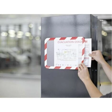 Sichthüllen mit Rahmen mit Magnetverschluss DIN A4. vollmagnetischer Rücken • Anwendung: Zum sicheren und geschützten Präsentieren von Dokumenten und Informationen. • Ausführung: vollmagnetischer Rücken zur Befestigung auf allen Metalloberflächenflexible Befestigung: Hoch- oder Querformathochwertige Anti-Reflex-Folie für bessere Lesbarkeitbreite Öffnung mit magnetischem VerschlussRahmen mit abgerundeten EckenStreifendesign für eine attraktive Präsentation von SicherheitshinweisenMaße: für DIN A4 (242 x 329 mm) • Vorteil: leichtes und schnelles Einlegen/Entfernen von DokumentenMagnetverschluss sorgt für optimalen Halt
