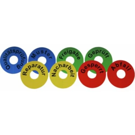 Signalringe aus PVC-Hartfolie zur Kennzeichnung von Ware • Anwendung: Diese Signalringe in verschiedenen Farben unterstützen bei der Wareneingangs- und Qualitätskontrolle. Das Ampelsystem macht sofort sichtbar, welche Waren weiterverarbeitet werden können. Signalringe sind beidseitig bedruckt. • Ausführung: robuste PVC-Anhänger, kreisrund ausgestanzt mit Durchmesser 30mmkann schnell und platzsparend an Gitterboxen etc. angebracht werdenmehrfach verwendbarin 8 Ausführungen erhältlich