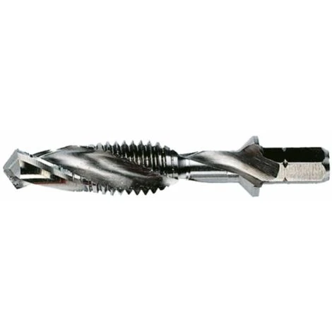 Kombigewinde-Bit für den universellen Einsatz bis 700 N/mm² • Anwendung: Zur Herstellung von metrischen Gewinden (Bohren. Gewinde. Entgarten und Gewinde säubern in einem Arbeitsgang!) zur portablen Nutzung auf Akkubohrschraubern und Handbohrmaschinen mit Rechts-und Linkslauf in den Materialgruppen Stahl. NE-Metallen und (Guss) bis zu einer Festigkeit von 700 N/mm² bis 1xD Gewindetiefe in der Eizelteilefertigung. • Ausführung: präzisionsgeschliffener. rechter Gewindebohrer mit Bohrstufe und 1/4 Sechskantantrieb • Vorteil: Standardgeometrie mit sehr gutem Preis- Leistungsverhältnishohe Produktivität da Bohren. Gewinde. Entgarten und Gewindesäubern in einem Arbeitsgang erfolgenrobuste Metallbox schützt das Werkzeug vor Beschädigung und Verschmutzung
